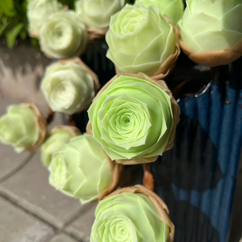 - Die Blätter saftiger Rosen haben oft die Form einer Rosenblüte und manchmal sogar eine rosenartige Textur.