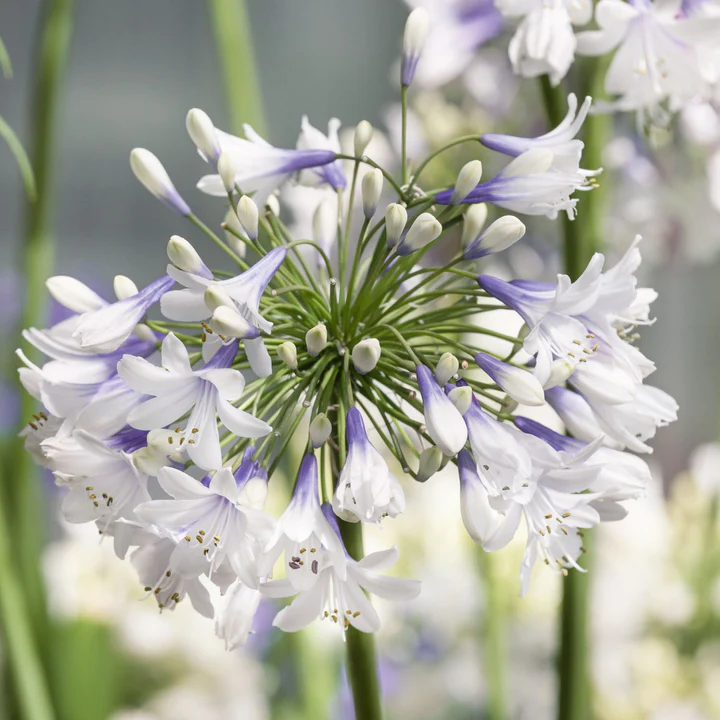 African Twister ist ein auffälliges neues Mitglied der Agapanthus-Familie. Es protzt mit großen, runden, bis zu 122 cm hohen, zweifarbigen Blütenbüscheln über riemenartigem grünem Laub. Und als ob das nicht genug wäre, wechseln die Blüten wie durch Zauberei von Blau an der Kehle zu Weiß an den Blütenblatträndern!